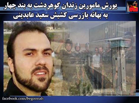 #بگونه: بنابه گزارش رسيده، صبح امروز 94/4/30 دژخيم گرامی رئیس بند چهار زندان گوهردشت كرج (رجایی شهر) به همراه شماري ديگر ي از ماموران اين زندان به بهانه بازرسی کشیش سعيد عابدینی به اين بند يورش برده و با بيدار كردن وي از خواب به تفتیش بدنی و بازرسي وسایل او مبادرت نمودند. همچنين ماموران زندان وسایل باتیر شاه محمد اف را نیز بازرسی کردند. دلایل این يورش وحشيانه و تفتيش و بازرسی و اينكه چه کسی دستور آن را صادر كرده است هنوز معلوم نيست. سعید عابدینی يك شهروند تبعه آمریکا و باتیر شاه محمد اف تبعه ترکمنستان می باشد.