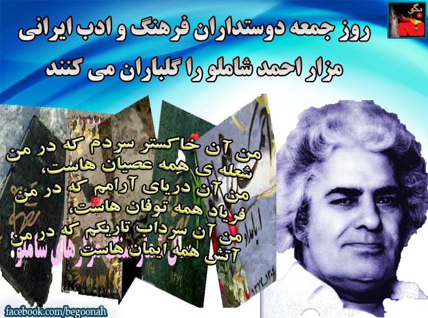 #بگونه: در حالیکه در این روزها شاهد خشم و خروش معلمان نسبت به تمامی حقوق پایمال شده اشان در طی سالهای گذشته می باشیم، فرهیختگان آزاده کشور همراه با کانون نویسندگان و دوستداران فرهنگ و ادب ایرانی، با انتشار فراخوانی اعلام نمودند که در روز جمعه همزمان با پانزدهمین سالگرد درگذشت » احمد شاملو » ، متخلص به الف. بامداد یا الف. صبح، شاعر، نویسنده، روزنامهنگار، پژوهشگر، مترجم، فرهنگنویس ایرانی و از بنیانگذاران و دبیران کانون نویسندگان ایران، با گردهمایی بر سر مزار این بزرگ مرد آزاده ایرانی، مزارش را گلباران خواهند نمود. در این فراخوان آمده است :
