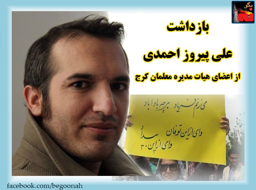 #بگونه: روز شنبه، علی پیروز احمدی از اعضای هیات مدیره کانون صنفی معلمان کرج باز داشت شد. وی که از قبل ازتجمعات 31تیرماه به پلیس امنیت استان البرز فراخوانده شده بودصبح شنبه بامراجعه به این نهاد ، مورد بازجویی قرارگرفت.