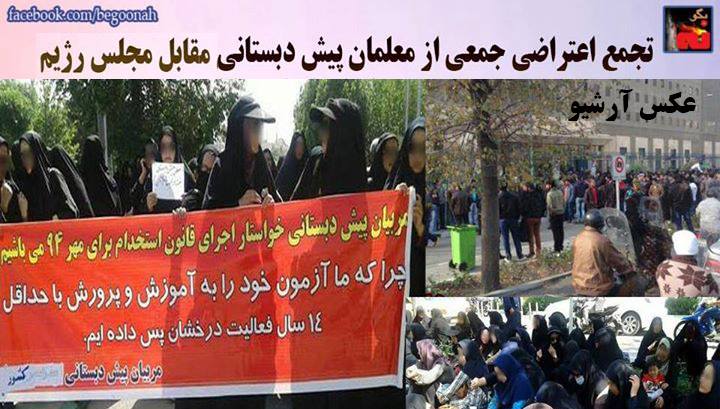 #بگونه:بگزارش رسانه های حکومتی صبح یکشنبه 4 مردادماه بیش از ۵۰۰ نفر از مربیان پیش دبستانی و حق التدریسیهای آموزش فنی و حرفهای مقابل مجلس رژیم در تهران تجمع کردند. مربیان پیش دبستانی در مقابل مجلس با سردادن شعارهای «نیروی پیش دبستانی – استخدام استخدام»، خواستار استخدام خود در آموزش و پرورش شده اند. همچنین نیروهای حق التدریسی دانشکده فنی و حرفهای با در دست داشتن پلاکاردهایی با مضمون «بیعدالتی تا کی» و «تبعیض و بلاتکلیفی تا کی» خواهان مشخص شدن وضعیت استخدام خود شدند.