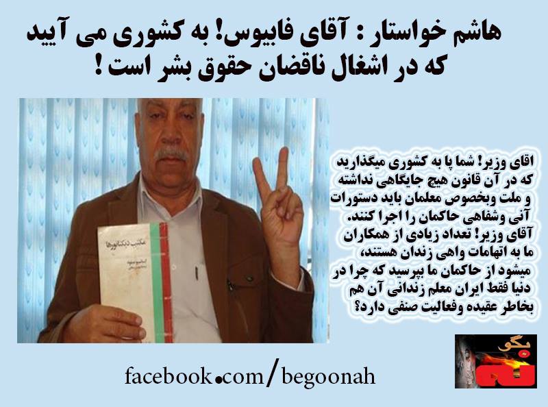 #بگونه : هاشم خواستار زندانی آزاد شده ،معلم بازنشسته و نماینده کانون صنفی معلمان در خراسان در نوشته ای به سفر آقای لوران فابیوس وزیر امور خارجه به ایران اعتراض کرد.