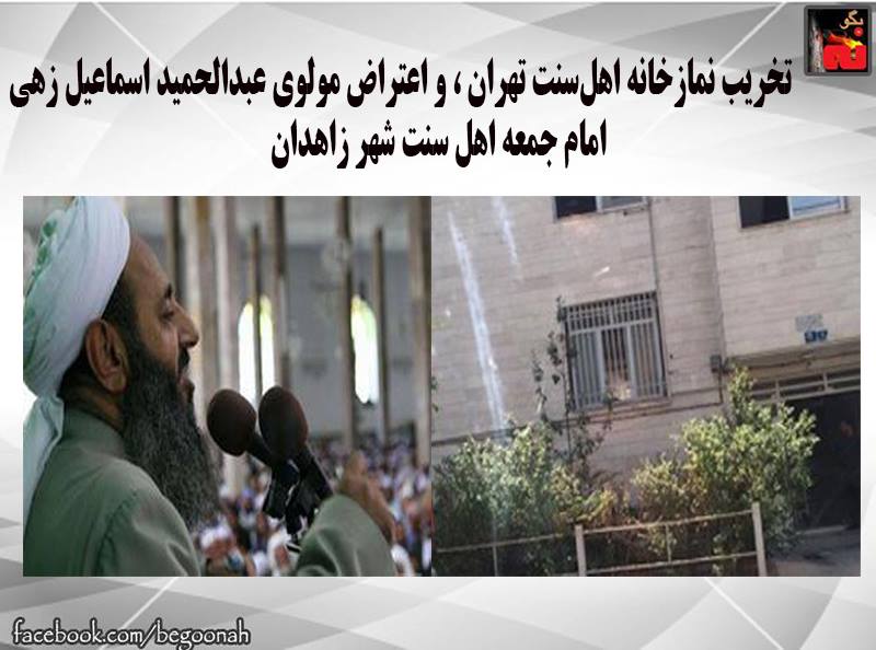 تخریب نمازخانه اهلسنت تهران ، و اعتراض مولوی عبدالحمید اسماعیل زهی امام جمعه اهل سنت شهر زاهدان