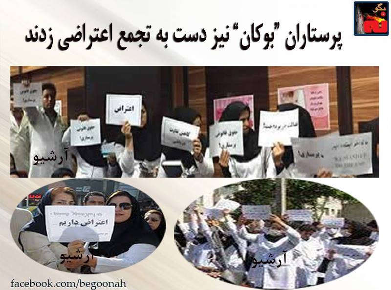 #بگونه: در ادامه تجمعات اعتراضی پرستاران مبنی بر طرح پرداخت مبتنی بر عملکرد پرستاران، طی آخرین اخبار دریافتی روز شنبه 10 مردادماه 1394 جمعی از پرستاران و کارکنان بخشهای مختلف بیمارستان بوکان نیز با تجمع در برابر ساختمان اداری این بیمارستان نسبت به اجرای این طرح رژیم ساخته اعتراض کردند.