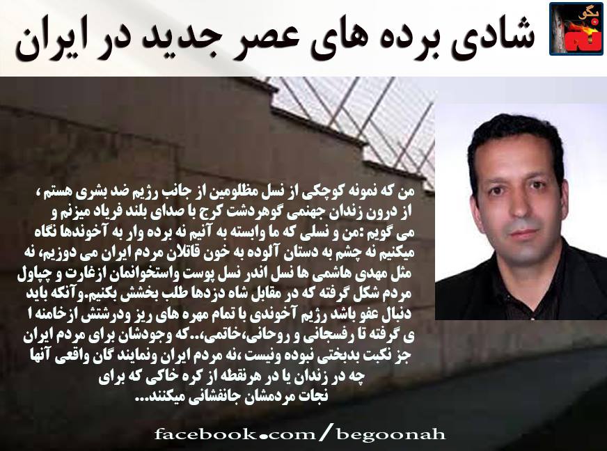 #بگونه : شادى برده هاى عصر جديد درايران ، عنوان نوشته ای است از «صالح كهندل» زندانی سیاسی محبوس در زندان گوهردشت کرج :