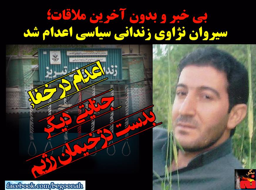 #بگونه: امروز یکشنبه هیجدهم مرداد ماه سیروان نژاوی زندانی سیاسی کرد در زندان تبریز به دار آویخته شد. حسین نژاوی برادر سیروان نژاوی با اعلام این مطلب گفت که امروز بعد از ظهر طی تماسی از سوی مسئولین زندان تبریز از آنها خواسته اند که برای تحویل گرفتن جنازه برادرشان به زندان تبریز مراجعه نمایند.