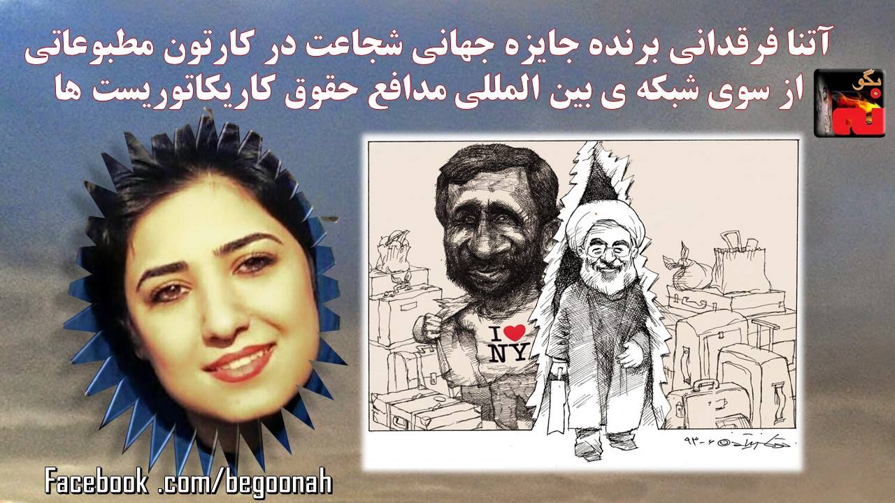 #بگونه: به گزارش ” كمپين آتنا فرقداني را آزاد كنيد” آتنا فرقدانی هنرمند کارتونیست زندانی برندهی جایزهی شجاعت در کشیدن کاریکاتور از سوی شبکهی بینالمللی مدافع حقوق کاریکاتوریستها(CRNI) شد. خانم فرقدانی اولین زن در جهان می باشد که به شکل انفرادی برنده ی این جایزه جهانی شده است.