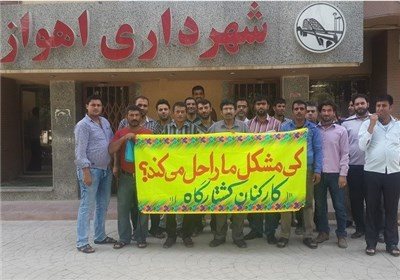 #بگونه: روز شنبه ۲۴/مرداد/۱۳۹۴ کارگران کشتارگاه سنتی اهواز در اعتراض به بیکارشدنشان پس از صنعتی شدن کارگاه جلوی درب شهرداری رژیم در اهواز تجمع کردند. این کارگران با در دست داشتن نامههایی از مدیرکل بازرسی استانداری خوزستان و مدیرکشتارگاه صنعتی اهواز خواستند تا در یکی دیگر از سازمانهای شهرداری اهواز به کار گرفته شوند.