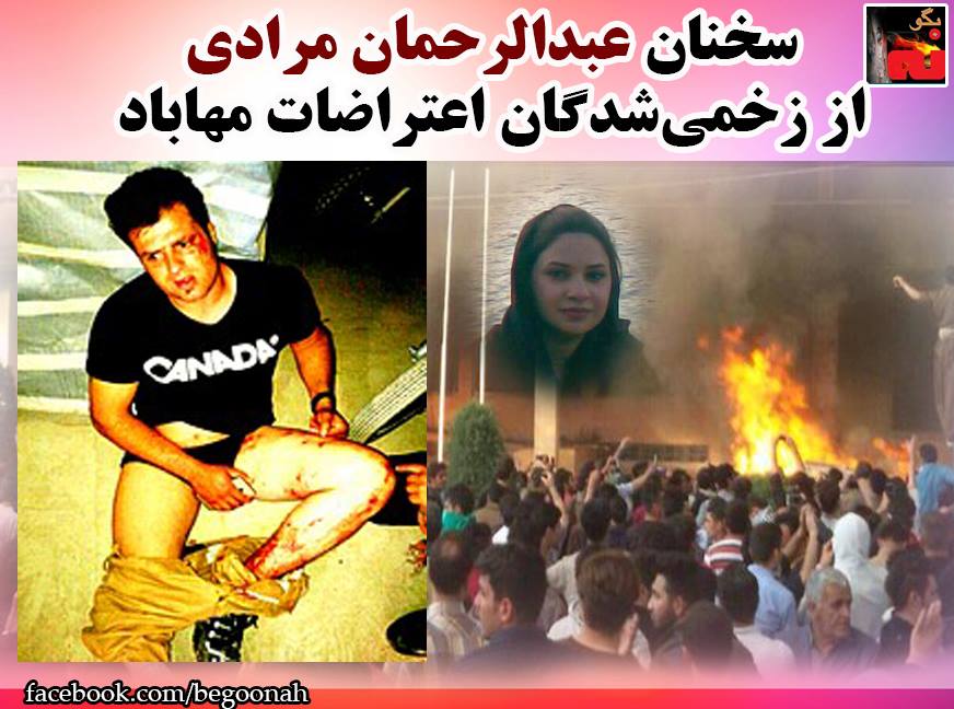 #بگونه:عبدالرحمان مرادی ,٣١ ساله، ورزشکار و از شاگرادان منصور آروند, یکی از زخمیشدگان اعتراضات اخیر مهاباد است که بعد از ٢٢ روز زندگی مخیفانه و با وجود وضعیت وخیم جسمانی براثر شلیک ٣٢ ساچمه دژخیمان رژیم به بدنش بدلیل نداشتن امنیت جانی و تحت پیگرد بودن مجبور به فرار از ایران شده است. عبدالرحمان هماکنون به کشور ترکیه پناهنده شده است و طی این مدت نیروهای اطلاعاتی رژیم خانواده وی را تحت فشار قرار دادهاند که باید وی را به ایران باز گردانند.