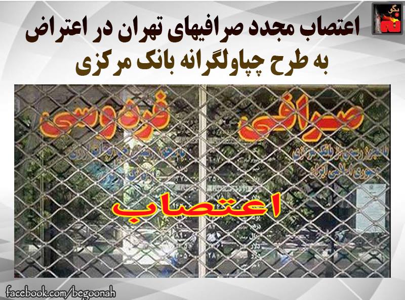 #بگونه : صرافیهای تهران در خیابان فردوسی و منوچهری بار دیگر در اعتراض به طرح چپاولگرانه بانک مرکزی ، اعتصاب کردند. بر اساس این طرح که مورد اعتراض صرافیها قرار گرفته و صرافیها اعلام کرده اند که زیر بار آن نخواهند رفت ،بانک مرکزی رژیم صرافیها را مجبور کرده است که نصف سرمایههای خود را در این بانک قرار دهند ، وبرای اجرای این طرح ، ضربالاجل ۱۰ روزه مهلت داده و صرافیها را در صورت عمل نکردن به آن تهدید به پلمپ مغاره هایشان نموده است .