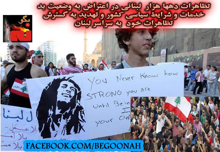 #بگونه : 7شهریور 94 دهها هزار نفر در بیروت پایتخت لبنان تظاهرات کردند و علیه فساد شعار دادند. آنها خشم خود را نسبت به وخامت وضعیت خدماتی بهویژه بحران زبالهها نشان دادند. شرکت کنندگان در این تظاهرات با تعیین ضربالاجلی 72ساعته خواستار استعفای وزیر محیط زیست لبنان شدند. در ساعتهای پایانی شب گذشته شماری از تظاهر کنندگان خشمگین که اکثراً از جوانان بودند با نیروهای امنیتی درگیر شدند.