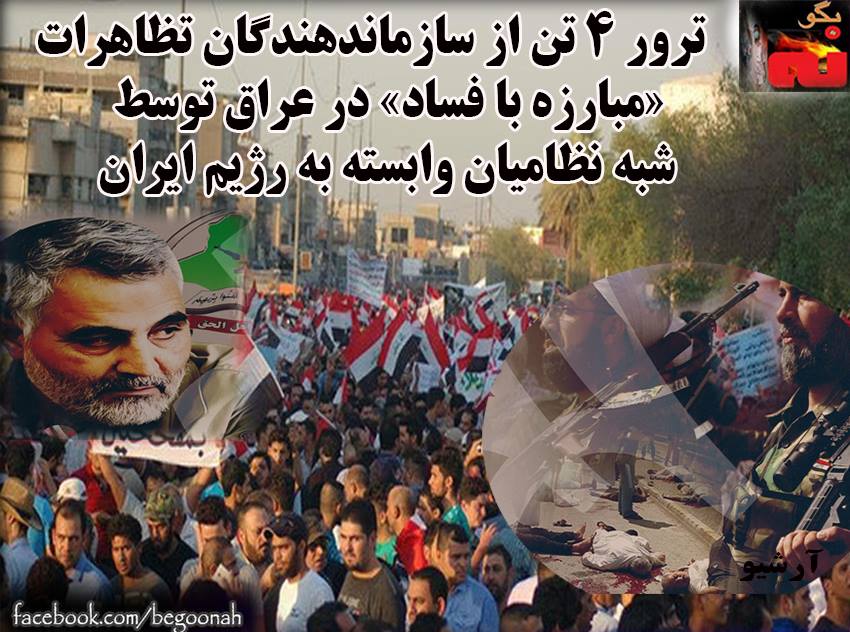 #بگونه: حضور قاسم سليماني در عراق بي دليل نيست. او براي نجات مالكي رفته است و ترور جنايتكارانه سازماندهندگان تظاهرات هاي مردمي در عراق توسط شبهه نظاميان وابسته به رژيم ايران از اقدامات قاسم سليماني است. سایتهای «جی بی سی نیوز» و «هیئت علمای مسلمين عراق» اعلام كردند كه ۴ تن از سازماندهندگان تظاهرات «مبارزه با فساد» در بغداد، ناصریه و بصره، توسط «افراد ناشناس» ترور شدهاند.