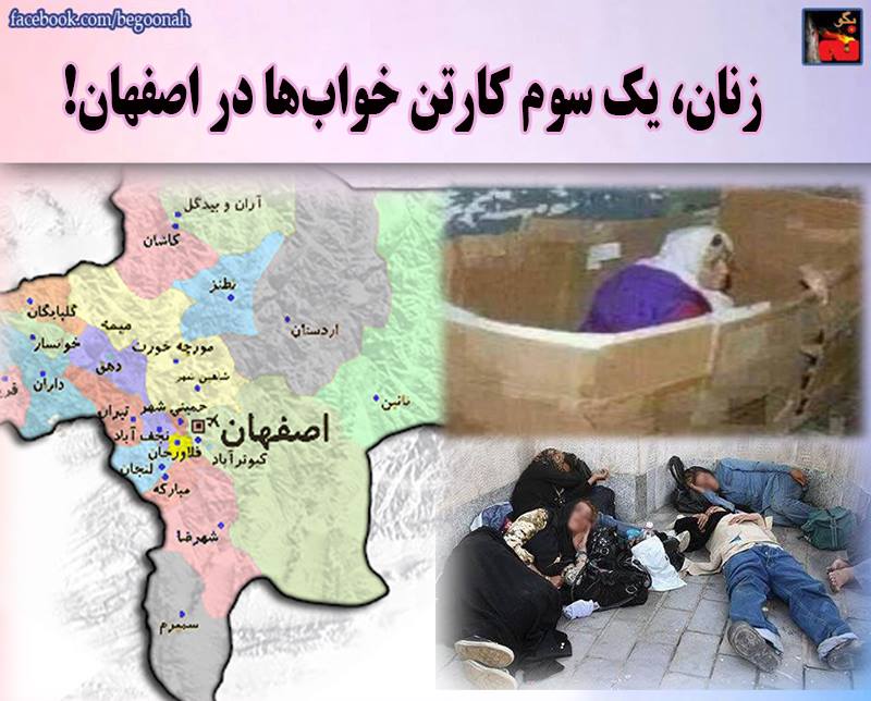 #بگونه: فقر و بی خانمانی در دوره آخوند روحانی بیشتر شده تا جاییکه کارگزاران دولت روحانی به آمار تکاندهنده ی کارتن خوابی اعتراف میکنند . در این میان مرضیه فرشاد، معاون پیشگیری اداره کل بهزیستی استان اصفهان در دولت آخوند روحانی ،در گفتگو با خبرگزاری حکومتی مهر بتاریخ دوشنبه ۹ شهریور ماه اذعان کرد: «بر اساس آخرین آمار منتشره از سوی معاونت امور «زنان و خانواده» ریاست جمهوری در خصوص تعداد زنان کارتن خواب از ۱۵ هزار کارتن خواب ایرانی ۵ هزار نفر از آنها زن هستند، آمار یک سومی زنان کارتن خواب در استان اصفهان نیز صدق میکند».