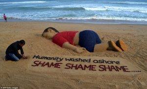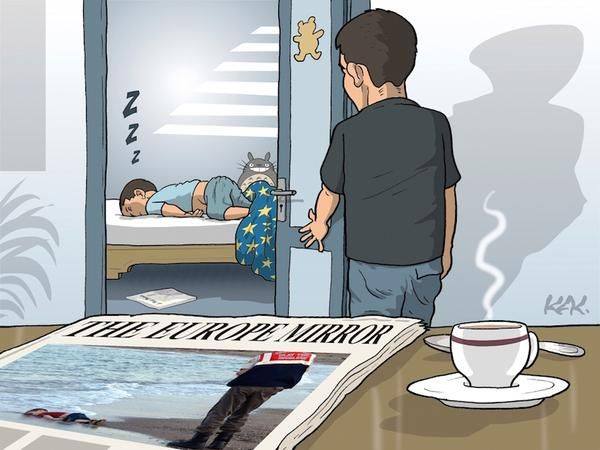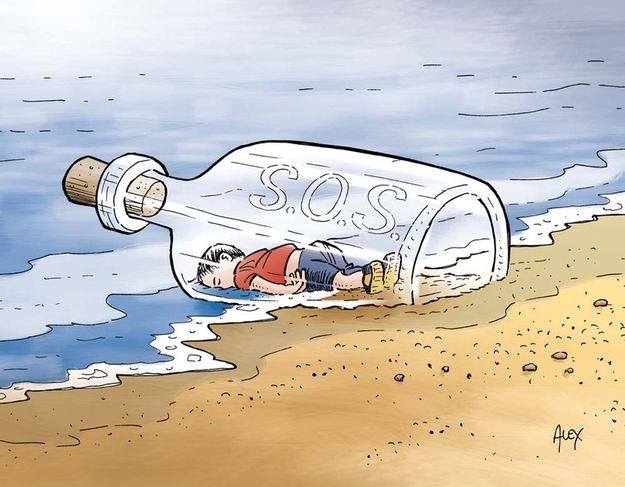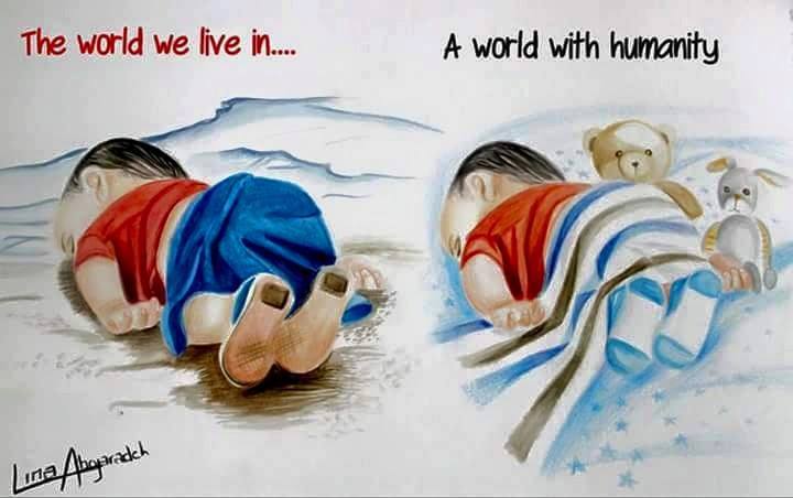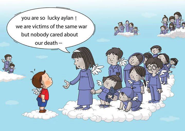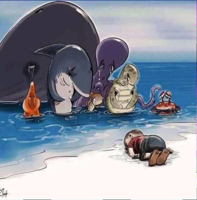 #بگونه: مرگ دلخراش كودك سوري چشمان بشريت را در سرتاسر دنيا اشك بار نمود و داغ ننگي بر پيشاني خآئنين به آرمان انساني جامعه بشري شد. همان خائنين توطئه گر و همدست ديكتاتورهاي جنايتكار كه چشمان خود را بر قتل عام هزاران زنداني سياسي در ايران فرو بستند و با جلادان به مذاكره و معامله و توطئه چيني عليه رزمندگان راه آزادي نشستند. همان خائنيني كه پناهندگان ايراني در اشرف با همدستي آنها دست بسته قتل عام شدند. همان خائنيني كه نظاره گر كشتار و مرگ كودكان سوري و عراقي و .پناهجو.يان بي پناه و آواره بودند و به تماشاي جنايت هاي اسد و رژيم ايران و مرگ بي پناهان نشستند و به جاي اقدامي انساني بي عملي و بي شرافتي و خيانت خود را توجيه مي كردند . اما غرق شدن آيلان كردي در درياي مديترانه كه جنازه اش را موج ها به ساحل تركيه رساند چشمان بشريت را اشكبار و سوگوار و اين خائنين را رسوا و بي آبرو نمود و در نقاشي ها و كاريكاتورهاي هنرمندان سراسر جهان اين سوگ و وداع هويداست.