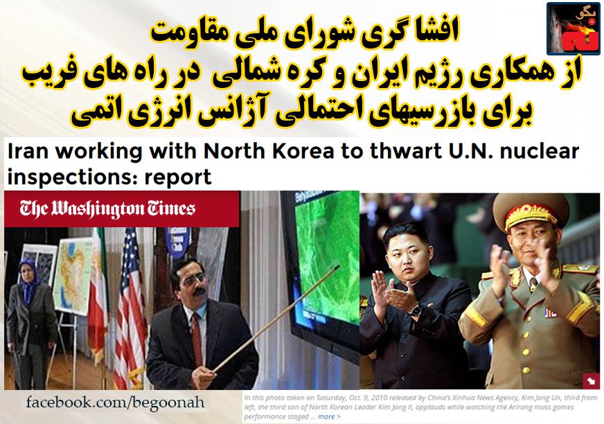 #بگونه: بگزارش واشنگتن تایمز، شورای ملی مقاومت ایران بر طبق اخبار و اطلاعات شبکه مردمی در داخل کشور، روز جمعه گزارش جدیدی منتشر و اعلام کرد: رژیم تهران با کارشناسان کره شمالی مشترکا در تلاشند تا بازرسان اتمی مللمتحد را در دیدار از سایتهای مظنون ایران، فریب دهند.