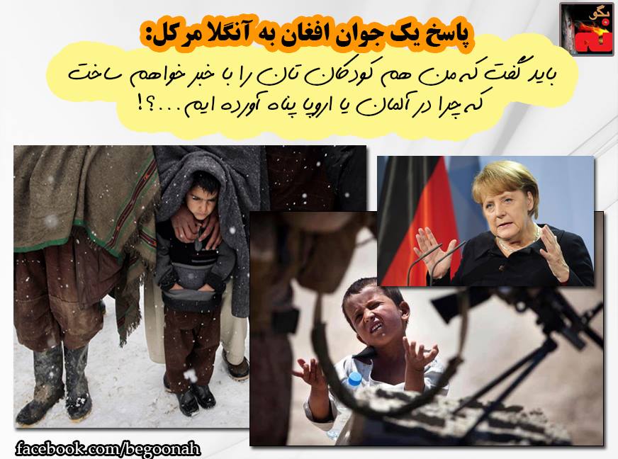 بانوی اول آلمان من یک جوان افغان مقیم در آلمان، فعال سیاسی و اجتماعی هستم به نمایندگی از پناهجویان و در جواب شما بايد گفت كه من هم کودکان تان را با خبر خواهم ساخت که چرا در آلمان یا اروپا پناه آورده ایم…؟