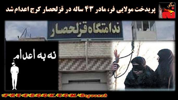 #بگونه: روز چهارشنبه ۷ مرداد ماه، يك زن زنداني بنام پريدخت مولايي فر، ۴۳ ساله و داراي يك فرزند پس از سه سال حبس در زندان قرچك ورامين به قزلحصار كرج انتقال داده شده و بهمراه ۳ زنداني دیگر در كرج در ملاء عام حلق آويز شد.