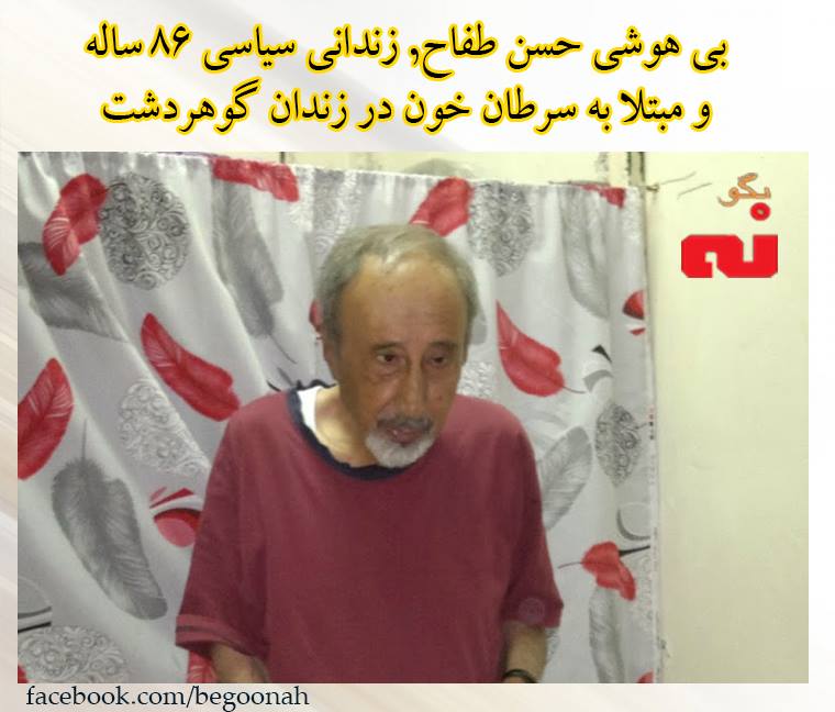 #بگونه: به گزارش مجموعه فعالان حقوق بشر، حسن طفاح، زندانی ۸۶ ساله زندان گوهردشت کرج که به بیماری سرطان خون مبتلاست، روز جاری دچار کم خونی شدید شد و پس از بی هوشی در زندان خودش با برانکارد راهی بیمارستان گردید.