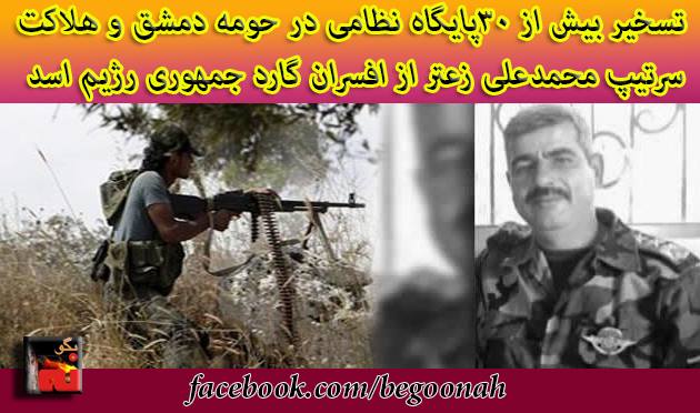 همزمان رسانهها و مطبوعات وابسته به رژیم اسد از کشته شدن سرتیپ ستاد محمدعلی زعتر خبر دادند. رزمندگان گفتند سرتیپ محمدعلی زعتر از افسران گارد جمهوری و یکی از فرماندهان رژیم اسد در شهرک اسد بود که توسط رزمندگان تک تیرانداز در حرستا به هلاکت رسید.