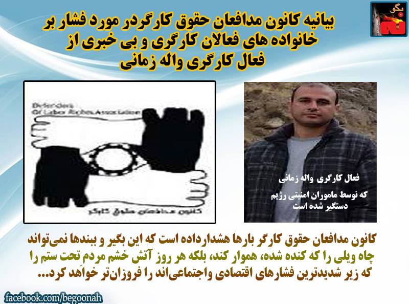 بیانیه کانون مدافعان حقوق کارگردر مورد فشار بر خانواده های فعالان کارگری و بی خبری از فعال کارگری واله زمانی