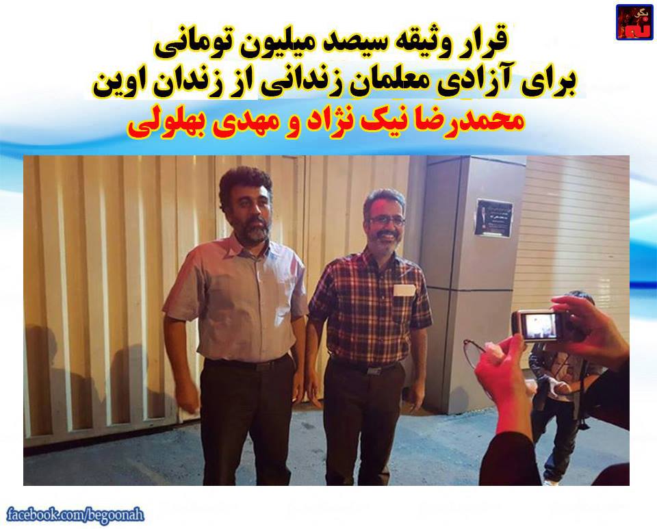 #بگونه: روز سه شنبه هفتم مهرماه مهدی بهلولی و محمدرضا نیک نژاد دو تن از معلمان زندانی، با قرار وثیقه سیصد میلیون تومانی از بند ۸ عمومی زندان اوین آزاد شدند.