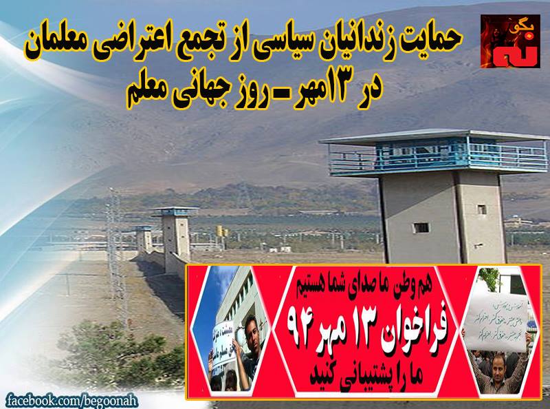 بدین وسیله ما زندانیان سیاسی ایران حمایت خود را از تجمعهای اعتراضی معلمان به جان آمده جلوی ساختمان آموزش و پرورش در سیزدهم مهر اعلام میداریم، باشد که با پیوستن اساتید دانشگاه، دانشجویان و دانشآموزان آزاده به این اعتراضات و نرفتن آنان به کلاس درس مدرسه و دانشگاه حرکت جدید و زدن مهر بطلان دیگری به تمامیت نظام حاکم از جانب معلمان، اساتید، دانشجویان و دانشآموزان و شعلهورتر شدن هر چه بیشتر مبارزات دموکراتیک – آزادیبخش مردمی باشد.