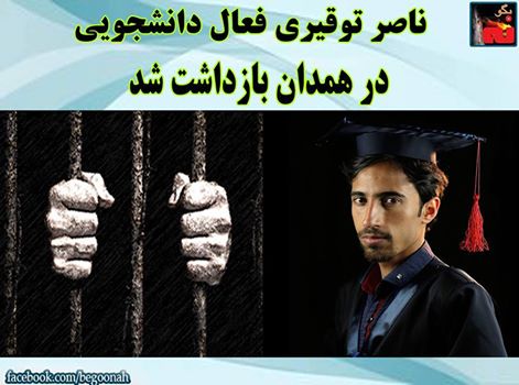 #بگونه: به گزارش مجموعه فعالان حقوق بشر در ایران، یک فعال دانشجویی دانشگاه بو علی سینا همدان بنام ناصر توقیری؛ از صبح چهارشنبه هشتم مهرماه در بازداشت اطلاعات نیروی انتظامی رژیم بسر می برد.