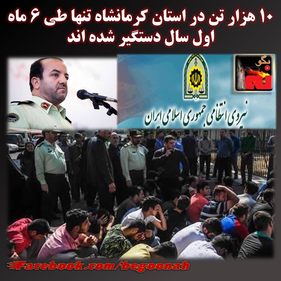 #بگونه: پاسدار منوچهر امان اللهی سرکرده نیروی انتظامی رژیم در استان کرمانشاه در مراسم صبحگاه مشترک نیروهای نظامی و انتظامی این استان اعلام کرد 10هزار نفر تحت عناوین اتهامات مختلف در شش ماهه ابتدای سال دستگیر شدند.