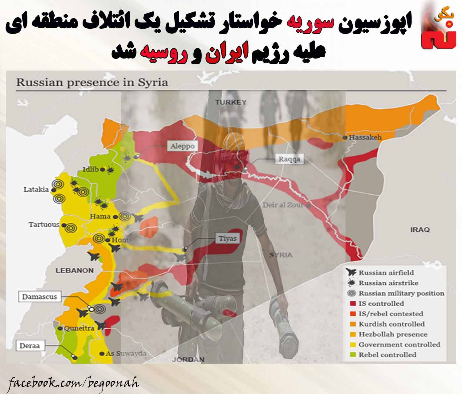 #بگونه : گروههای اپوزیسیون سوریه، دوشنبه ۵ اکتبر در بیانیهای خواستار تشکیل ائتلافی منطقهای علیه روسیه و رژيم ایران در سوریه شدند.