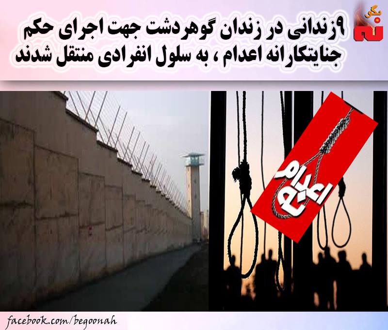 ۹زندانی در زندان گوهردشت جهت اجرای حکم جنایتکارانه اعدام ، به سلول انفرادی منتقل شدند
