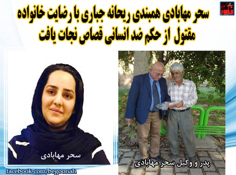 #بگونه: بر اساس گزارشات رسیده طی خبری که وکیل «سحر مهابادی منفرد» زندانی محکوم به اعدام به خانواده وی دادند بالاخره سحر مهابادی با رضایت و گذشت خانواده مقتول از حکم ضد انسانی قصاص نجات یافت.