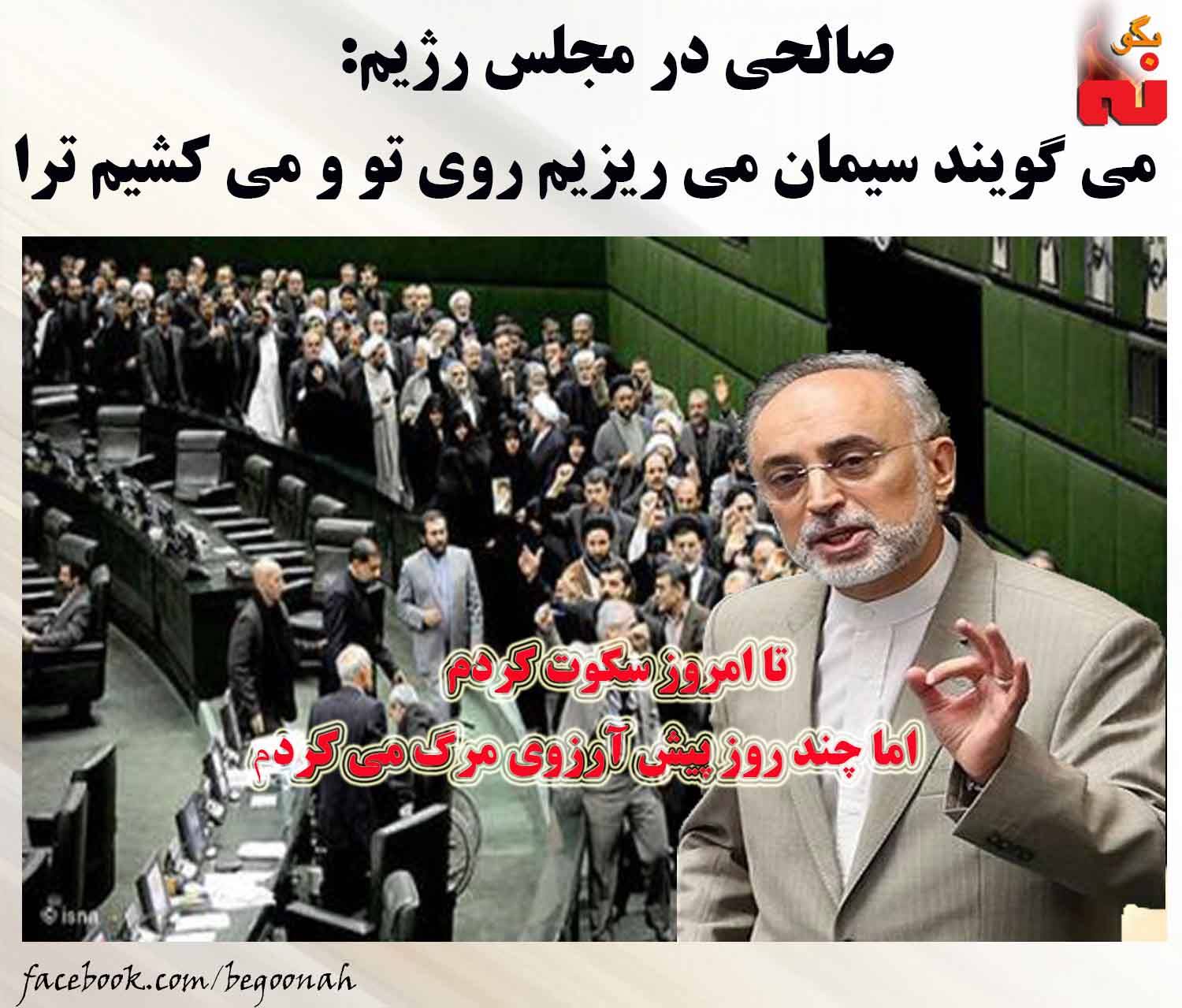 #بگونه: در جلسه روز يكشنبه 19مهر 94 برابر با 11 اكتبر مجلس رژيم هنگام بررسي برجام با سخنرانی علی اکبر صالحی، رئیس سازمان انرژی اتمی متشنج شد. به گزارش خبرگزاری مهر، هنگامی که صالحی در باره راکتور آب سنگین اراک سخنرانی می کرد، نمایندگان مخالف برجام به دور جایگاه سخنرانی حلقه زدند و با فریادهای «دو-دو» به اظهارات صالحی اعتراض کردند.