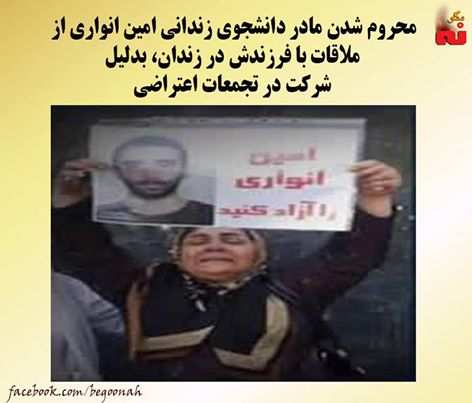 محروم شدن مادر زندانی سیاسی امین انواری ازملاقات با فرزندش در زندان، بدلیل شرکت در تجمعات اعتراضی