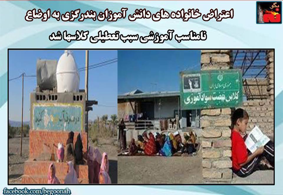 #بگونه: بر اساس گزارش خبرگزاری حکومتی پایگاه عدالت خواهان گلستان، صبح امروز، خانواده های دانش آموزان پایه های سوم و چهارم مقطع ابتدایی دبستانی در روستای کارکنده از توابع شهرستان بندرگز، با حضور در مدرسه و در اعتراض به اوضاع نامناسب آموزشی، فرزندان خود را از حضور در کلاس منع کرده و سبب تعطیلی کلاس ها شدند.
