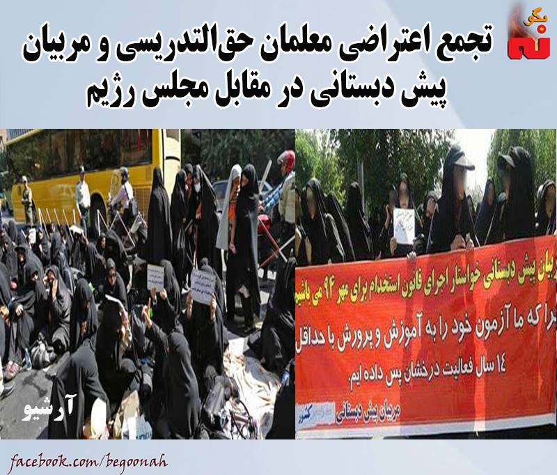 بنا بر گزارش رسیده ،جمعی از معلمان حقالتدریسی و مربیان پیش دبستانی از روز شنبه در مقابل مجلس رژیم،تحصن کرده و خواستار استخدام دائم هستند.