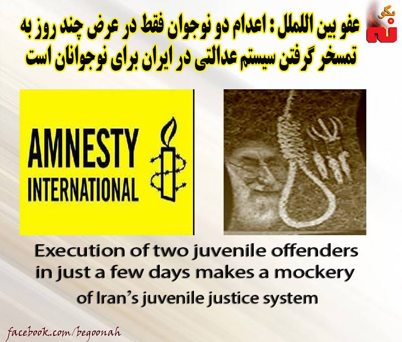 عفو بین الملل : اعدام دو نوجوان فقط در عرض چند روز به تمسخر گرفتن سيستم عدالتى در ايران براى نوجوانان است