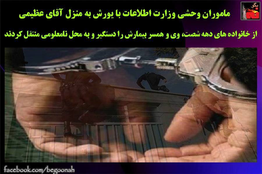 ماموران وحشی وزارت اطلاعات با یورش به منزل آقای عظیمی از خانواده های دهه شصت، وی و همسر بیمارش را دستگیر و به محل نامعلومی منتقل کردند