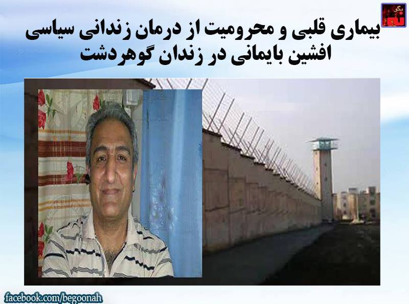 #بگونه : بنا به گزارش رسیده، دژخیمان زندان گوهردشت، زندانی سیاسی افشین بایمانی را که از بیماری حاد قلبی رنج میبرد از درمان محروم کرده اند.