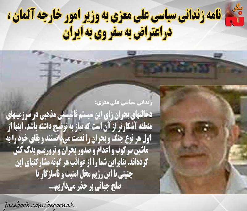 نامه زندانی سیاسی علی معزی به وزیر امور خارجه آلمان ، دراعتراض به سفر وی به ایران