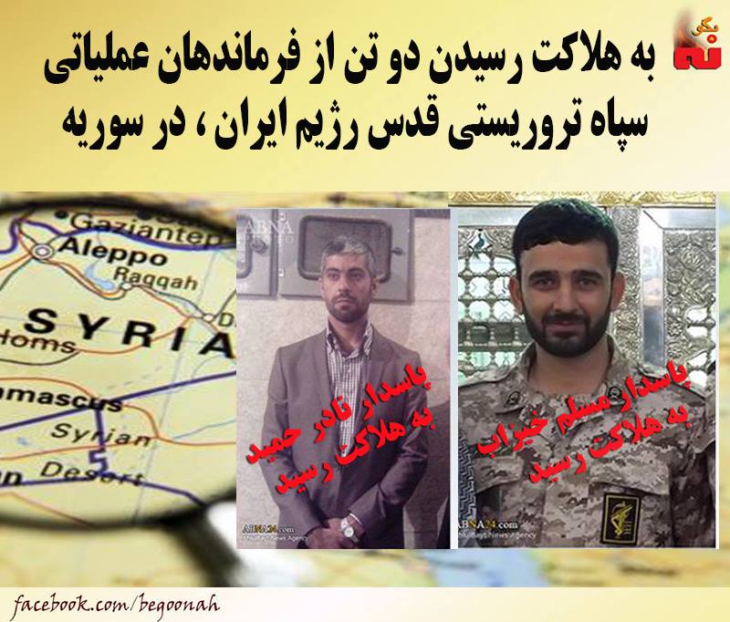 #ببگونه : بنا به گزارش خبرگزاری های حکومتی , دو تن از فرمانده هان سپاه پاسداران و سپاه قدس رژیم ایران ، در سوریه به هلاکت رسیدند.