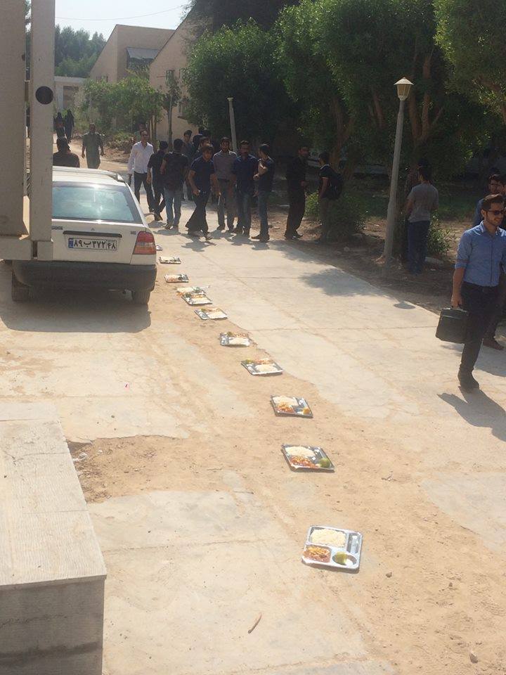 #بگونه: دیروز ظهر دانشجویانی که نسبت به وضعیت سلف و خوابگاه دانشگاه معترض بودند؛ در یک اقدام نمادین سینی های غذای خود را از روبروی سلف تا سازمان مرکزی دانشگاه چیدند. دانشجویان دانشگاه خلیج فارس مدتهای زیادی است که نسبت به نوع و کیفیت غذاهای سلف معترض هستند. در این خصوص یکی از دانشجویان این دانشگاه درباره کیفیت غذا می گوید: «کیفیت غذا روز به روز بدتر می شود، بطوری که ما ترجیح می دهیم خودمان علارغم کلاس های فشرده، غذا بپزیم. اما گاهی پیش می آید که بخاطر کمی وقت مجبور می شویم از سلف غذا بگیریم که غذای سلف هم بسیار بد است.»