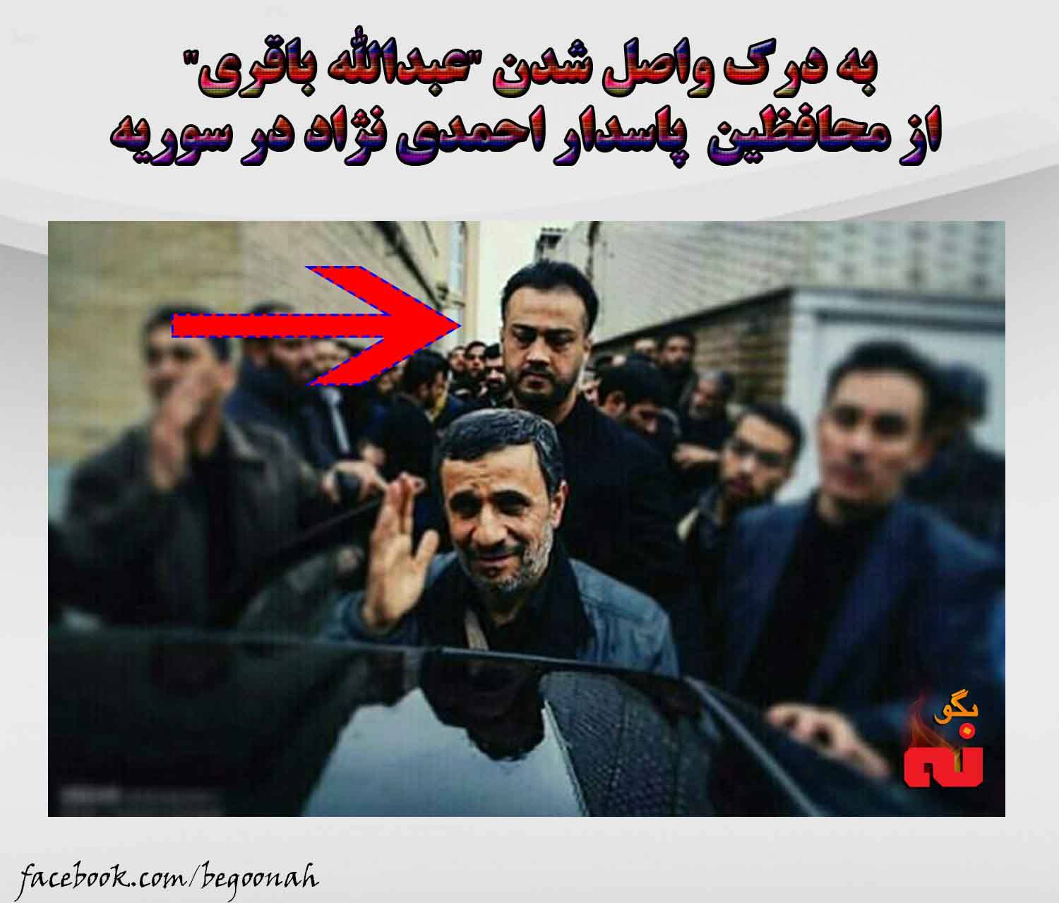 این خبرنگاری اذعان داشت عبدالله باقری که از پاسداران و محافظان پاسدار احمدی نژاد از زمان حضور احمدی نژاد در شهرداری و نیز در دوران ننگین ریاست جمهوری و همینطور پس از آن در کنار وی بوده است، به صورت داوطلبانه در سوریه حضور داشت.