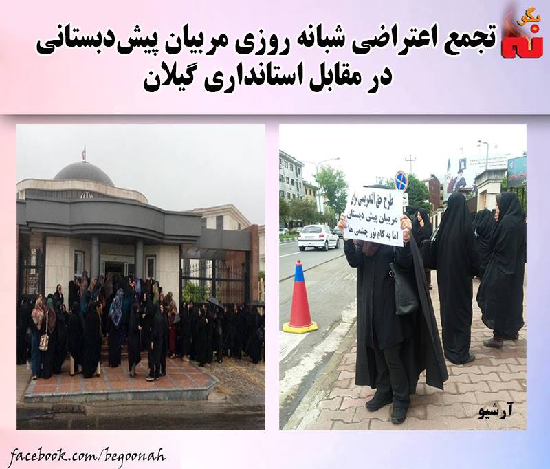 #بگونه: در راستای تجمعات اعتراضی معلمان کشور در اعتراض به فقر و کمبودهای آموزشی و بازداشت و به زندان افکندن معلمان توسط رژیم آخوندی و وجود فاحش تبعیض و جو امنیتی در سیستم آموزش و پرورش کشور، جمعی از مربیان پیشدبستانی شهرستانهای مختلف گیلان در مقابل استانداری این استان تجمع کردند و خواستار به تحقق پیوستن شعارهایی شدند که به آنان پیش از این بارها و بارها از سوی کارگزاران رژیم وعده داده شده بود.