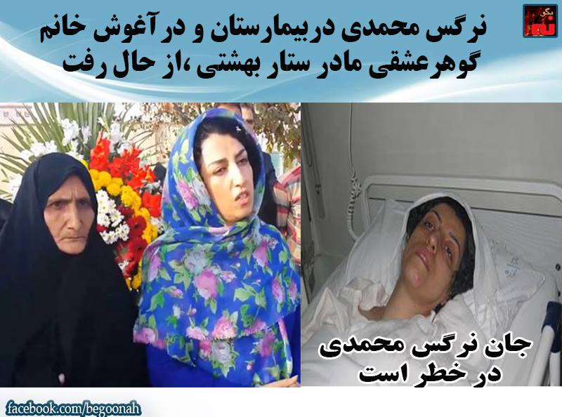 نرگس محمدی دربیمارستان و در آغوش خانم گوهرعشقی مادر ستار بهشتی ،از حال رفت