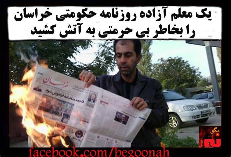 #بگونه: روز سهشنبه 5آبان 94 – یک معلم شریف و آزاده ميهن در اعتراض به بیاحترامی روزنامه حکومتی خراسان به معلمین در یک حرکت اعتراضی این روزنامه را به آتش کشیده و عكس اين حركت اعتراضي را در فضای مجازی گذاشت.