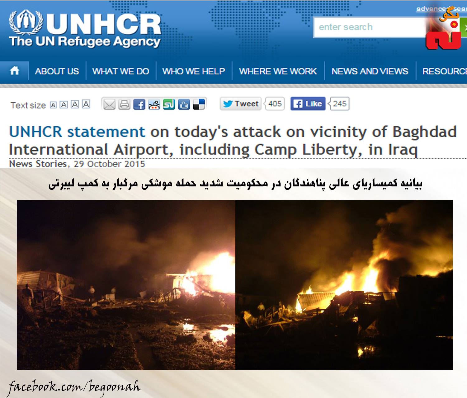 #بگونه: كميسارياي عالي پناهندگان سازمان ملل با انتشاراطلاعيه اي در وب سايت خود حمله موشكي امروز به کمپ پناهندگان ایرانی موسوم به لیبرتی را محكوم كرد.