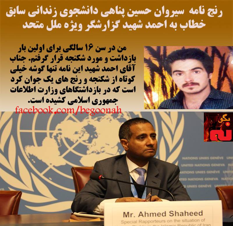 ”من در سن ۱۶ سالگی برای اولین بار بازداشت و مورد شکنجه قرار گرفتم. جناب آقای احمد شهید این نامه تنها گوشه خیلی کوتاه از شکنجه و رنج های یک جوان کرد است که در بازداشتگاهای وزارت اطلاعات جمهوری اسلامی کشیده است.”