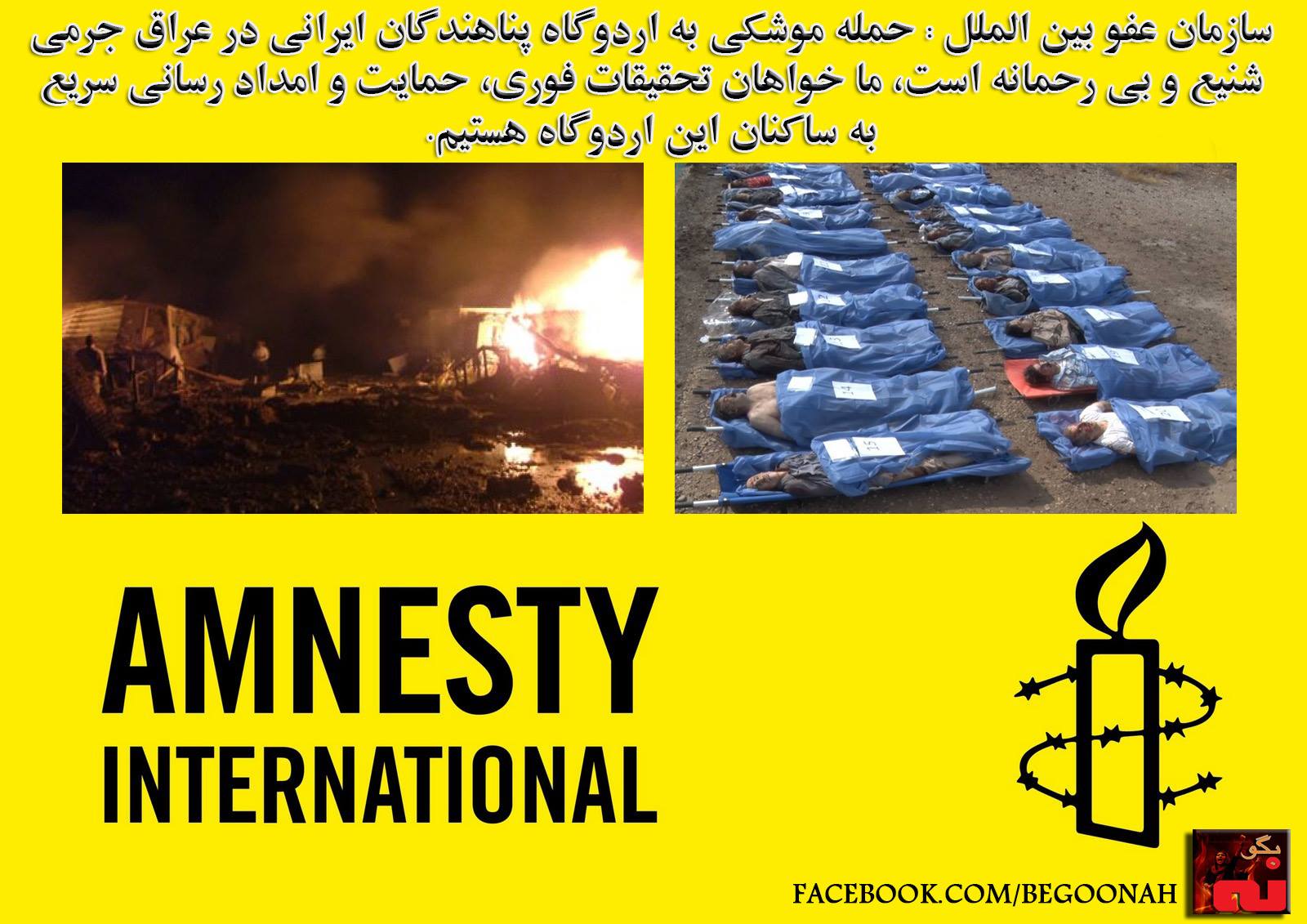 سازمان عفو بین الملل : حمله موشکی به اردوگاه پناهندگان ایرانی در عراق جرمی شنیع و بی رحمانه است، ما خواهان تحقیقات فوری، حمایت و امداد رسانی سریع به ساکنان این اردوگاه هستیم