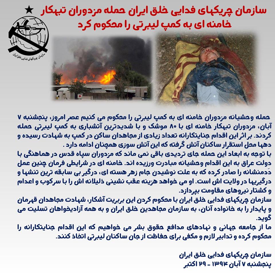 اخبار سازمان چريكهاي فدايي خلق ايران حمله مزدوران تبهكار خامنه اي به كمپ ليبرتي را محكوم كرد Date: اکتبر 30, 2015Author: begoonah 0 دیدگاه اشتراکگذاری این:بیشتر به اشتراک گذاشتن در فیسبوک (در پنجرۀ تازه باز میشود) فیسبوک اشتراکگذاری در X (در پنجرۀ تازه باز میشود) X چاپ (در پنجرۀ تازه باز میشود) چاپ اشتراکگذاری در تلگرام (در پنجرۀ تازه باز میشود) تلگرام اشتراکگذاری در واتساپ (در پنجرۀ تازه باز میشود) واتساپ