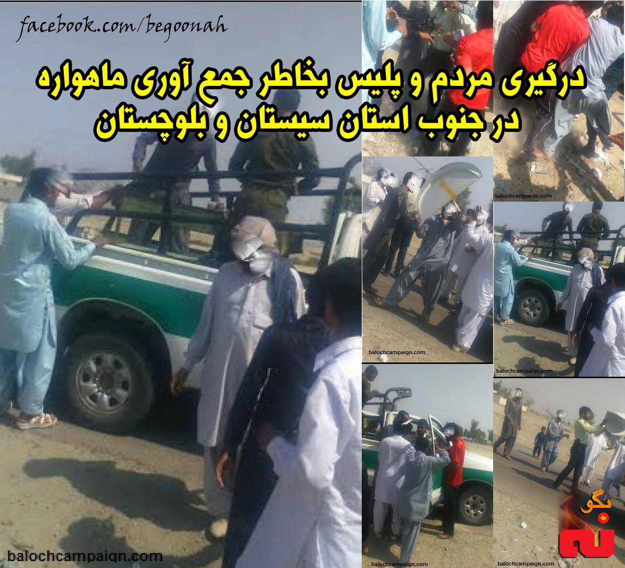 #بگونه: به گزارش کمپین فعالان بلوچ، 23 مهرماه مردم دهستان کاروان زر آباد واقع در جنوب استان سیستان و بلوچستان بخاطر جمع آوری و تخریب ماهواره ها با ماموران خامنه ای درگیر شدند.