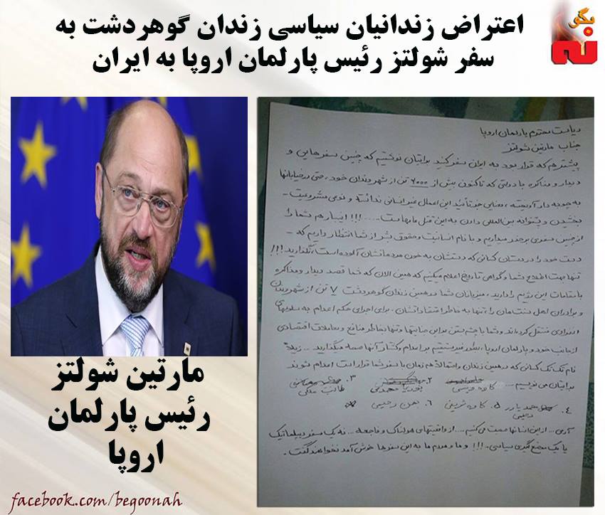 #بگونه : زندانيان سياسي زندان گوهردشت كرج طي نامه اي به سفر شولتر رئيس پارلمان اروپا به ايران اعتراض كردند. آنها در نامه خود با ياد آوري اعدام قریب الوقوع شماري از هم بندان خود نوشتند: